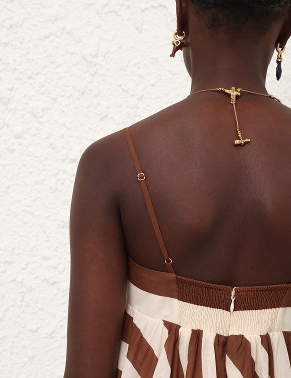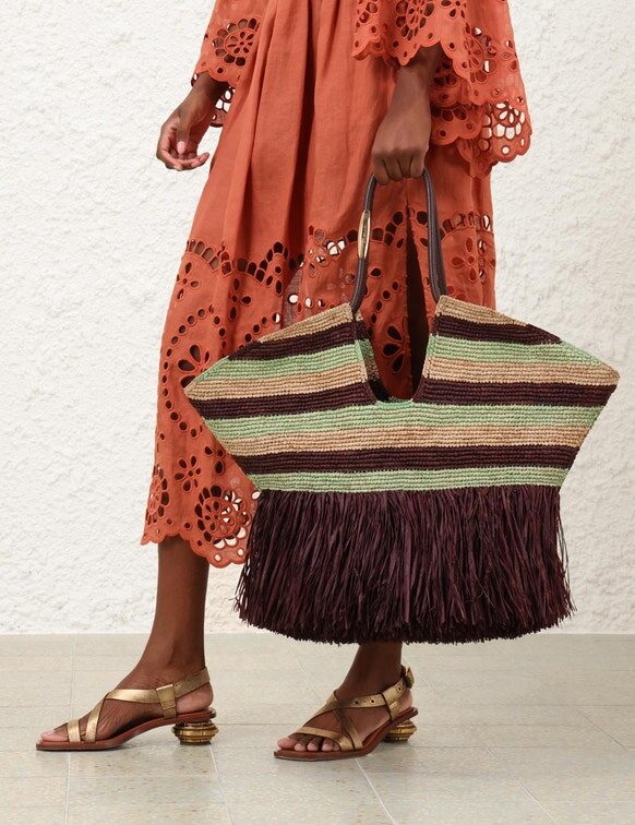 Handgewebt aus Raffia ist Goldentime der perfekte Sommerbegleiter: Seine Silhouette ist vom Surf-Universum und den organischen Formen der Meereslandschaft inspiriert, während sein endloser Schlauchgriff mit von Surfbrettern inspirierten Metallbeschlägen verziert ist. Mit verspielten, handgeschnittenen Fransen aus natürlichem Raffia verziert, bietet Goldentime Platz für alle Sommer-Essentials und ermöglicht einen mühelosen Übergang vom Strand in die Stadt.