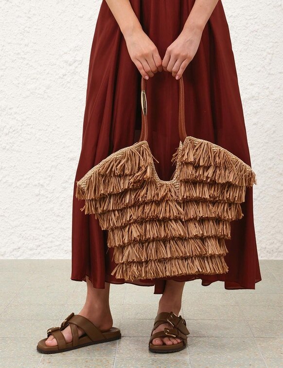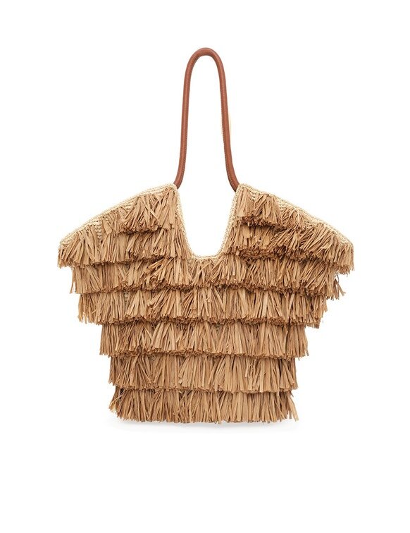 „Goldentime“ ist handgewebt aus Raffia und der perfekte Begleiter für den Sommer: Seine Silhouette ist von der Welt des Surfens und den organischen Formen der Meereslandschaft inspiriert, während sein endloser, röhrenförmiger Griff mit von Surfbrettern inspirierten Beschlägen verziert ist. Mit verspielten, handgeschnittenen Fransen aus natürlichem Raffia verziert, bietet Goldentime Platz für alle Sommer-Essentials und ermöglicht einen mühelosen Übergang vom Strand in die Stadt.