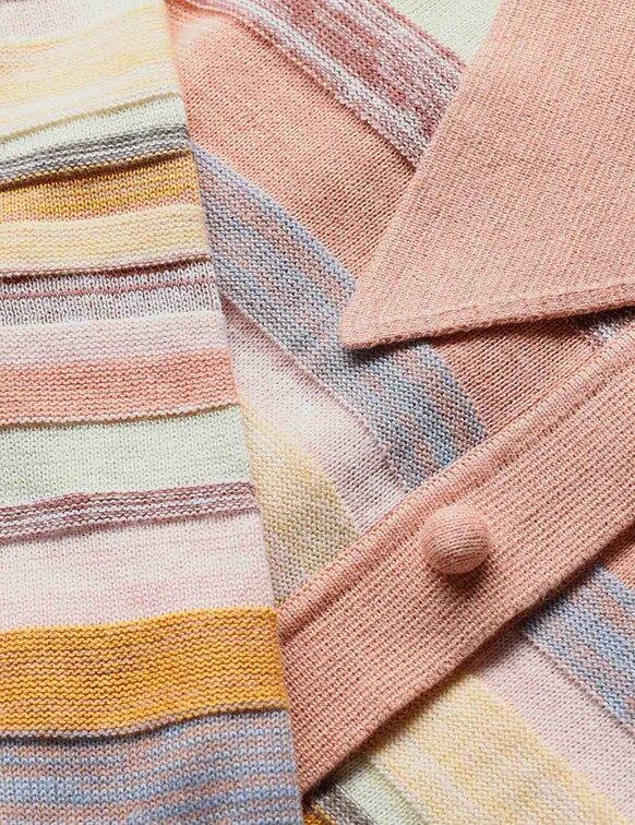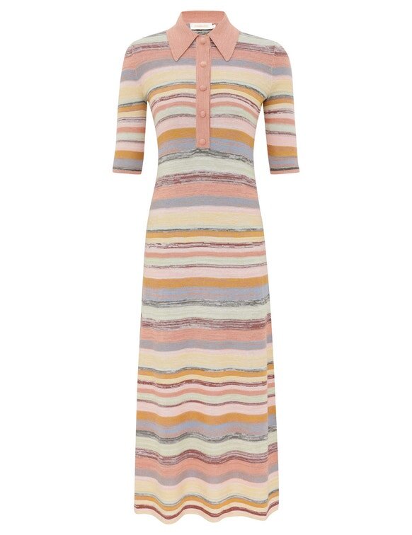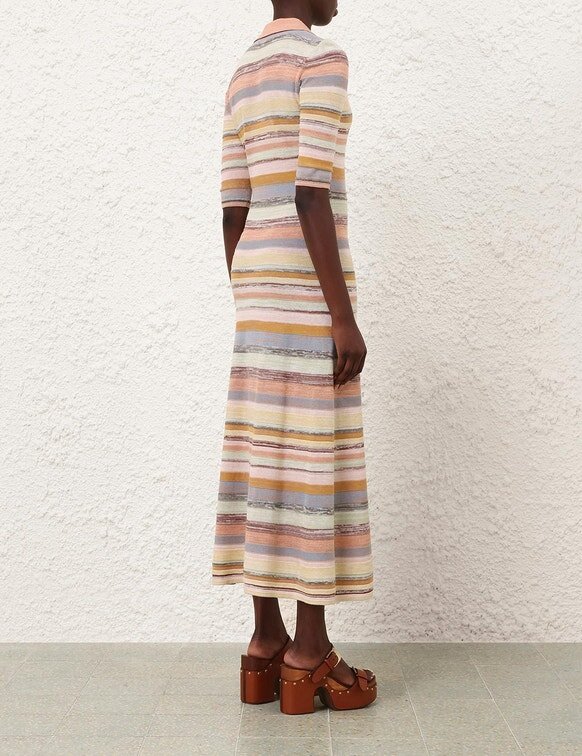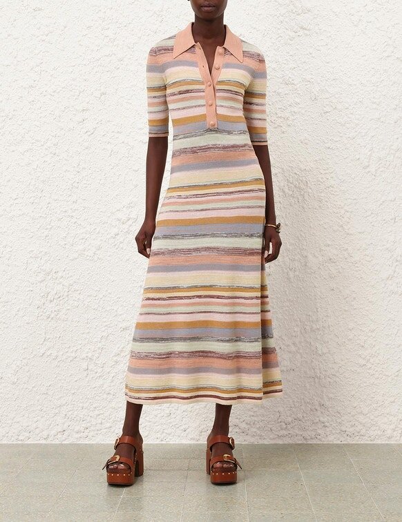 Das Luna Mouline Polo Midi-Kleid in Multistreifen aus unserer Frühjahrskollektion 2026, „Kindred Spirit“. Ein Midi-Kleid aus Baumwoll-Leinen mit klassischem Kragen, Dreiviertelärmeln, Knöpfen in der vorderen Mitte und einem locker fallenden Plissee-Rock.