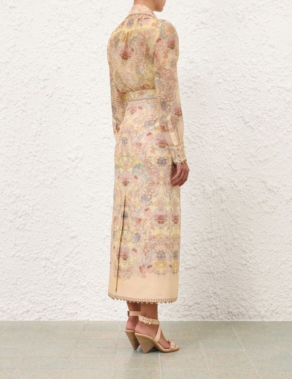 Der „Rebellion“-Bleistiftrock in „Lemon Floral“ aus unserer Cruise-Kollektion 2026, „Twisted Romance“. Ein Bleistiftrock aus Leinen mit mittlerer Leibhöhe, festem Bund und Reißverschluss in der hinteren Mitte.