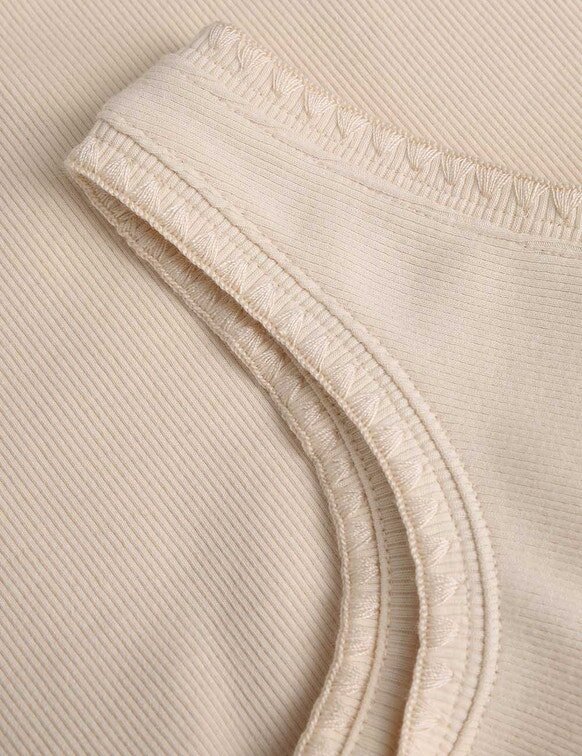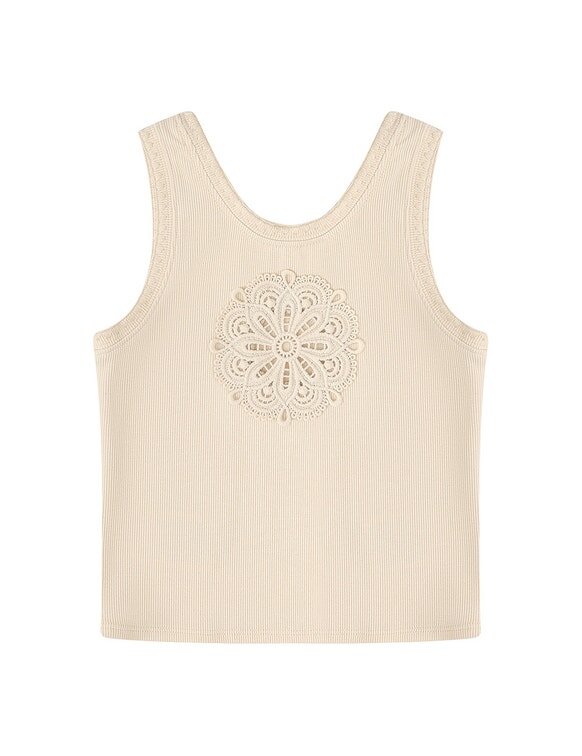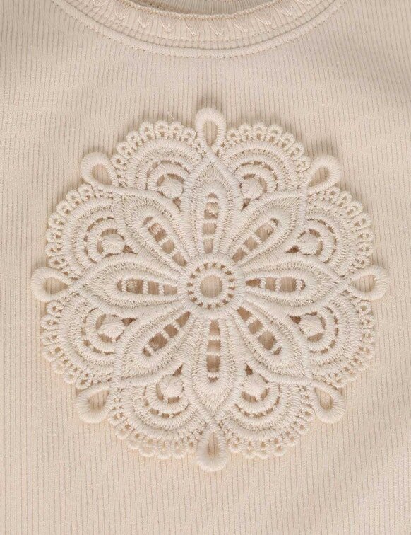 Das Aster Kinder-T-Shirt in Ecru aus unserer Sommer-Bademode-Kollektion 2026. Ein Kinder-Baumwoll-Tanktop mit U-Ausschnitt und Häkelstickerei.