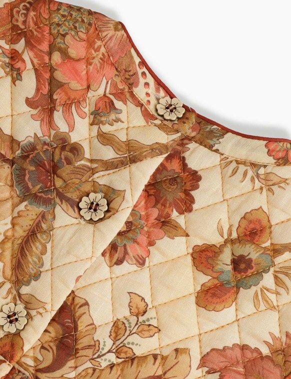 Das Aster Kinder-Steppkleid in Cream Jacobean aus unserer Sommer-Bademode-Kollektion 2026. Ein Kinderkleid aus Baumwolle mit hohem Rundhalsausschnitt, langen, weiten Ärmeln, Steppdetails an Vorder- und Rückenteil sowie einem ausgestellten Rock.